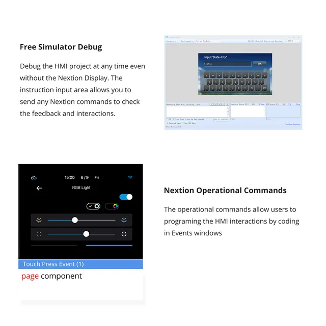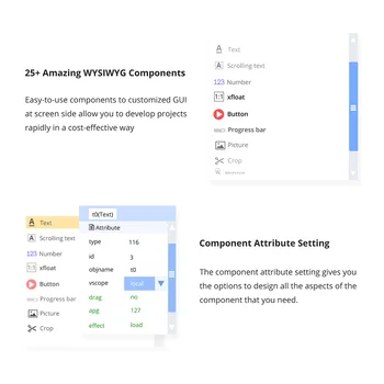 Nextion includes a hardware part (a series of TFT boards) and a software part. The Nextion TFT board uses only one serial port to communicate. It lets users avoid the hassle of wiring. We noticed that most engineers spend much time in application development but get unsatisfactory results. As a solution to this situation, Nextion editor has mass components such as button, text, progress bar, slider, instrument panel etc. to enrich the interface design. Furthermore, the drag-and-drop function ensures that users spend less time in programming, which will reduce 99% of their development workloads. With the help of this WYSIWYG editor, designing a GUI is a piece of cake.